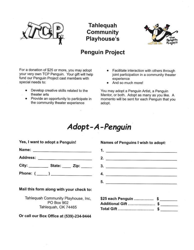 For a donation of $25 or more, you may adopt your very own TCP Penguin. Your gift will help fund our Penguin Project for a child with special needs to: develop creative skills related to the theater arts, provide an opportunity to participate in the community theater experience, facilitate interaction with age-level peers through joint participation in a community theater experience and so much more. You may adopt a Penguin Artist, a Penguin Mentor, or both. Adopt as many as you like. A certificate of adoption will be sent for each Penguin that you adopt.